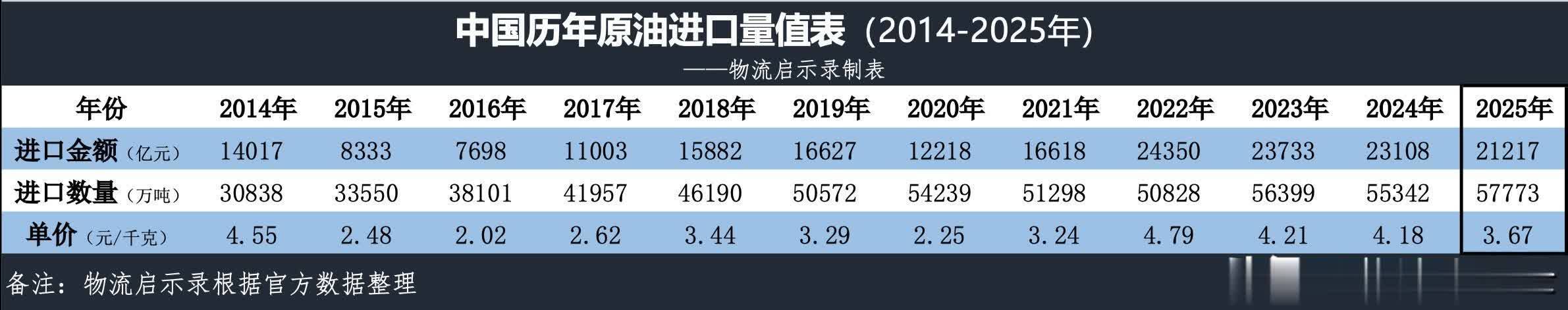 2025年kaiyun体育网页版登录,我国入口原油5.78亿吨,同比增长4.4%;入口金额2.12万亿元,同比下降8.3%。入口单价折约3.67元/千克(2024年入口单价折约4.18元/千克)。