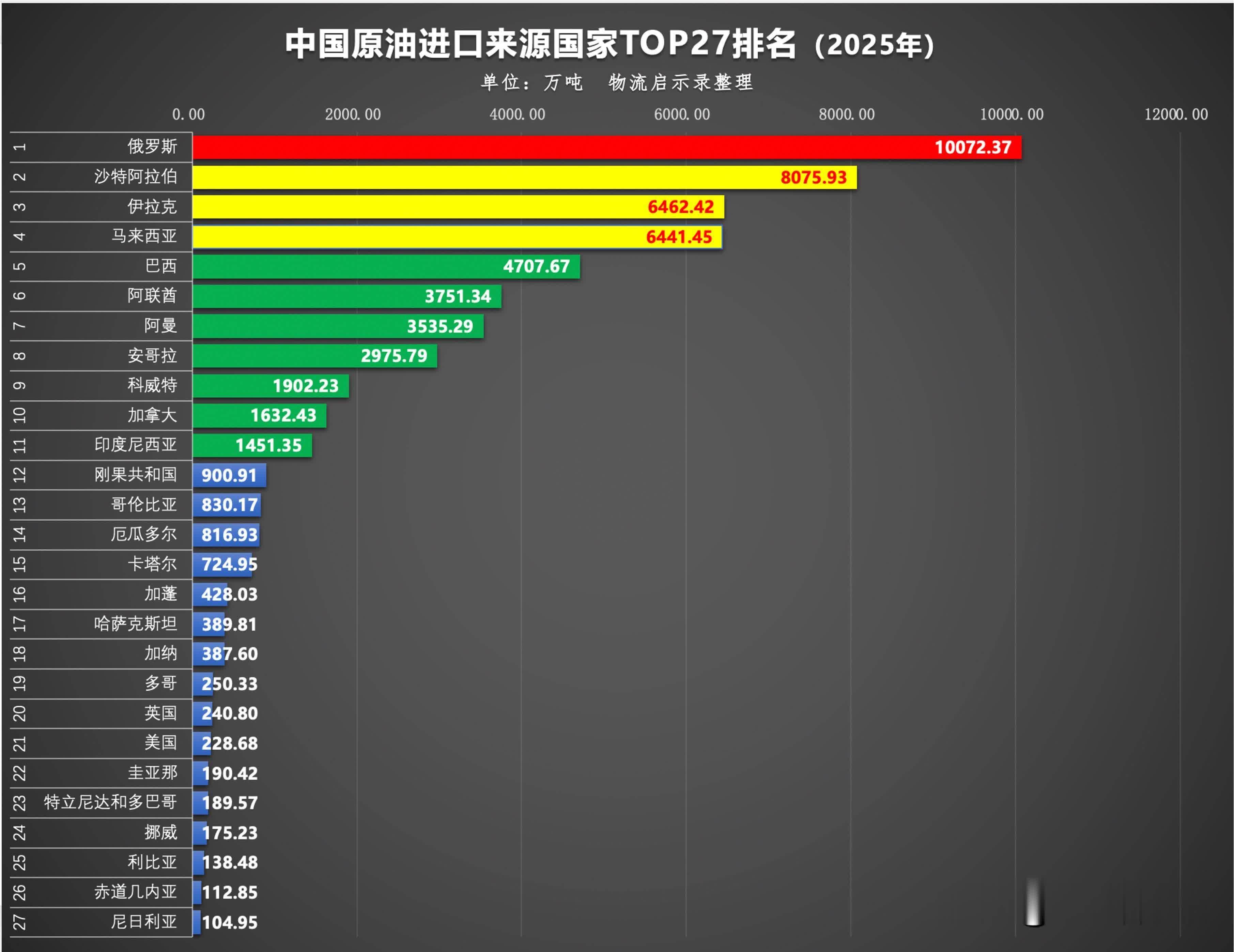 2025年中国原油入口开首国名次TOP27(按数目)