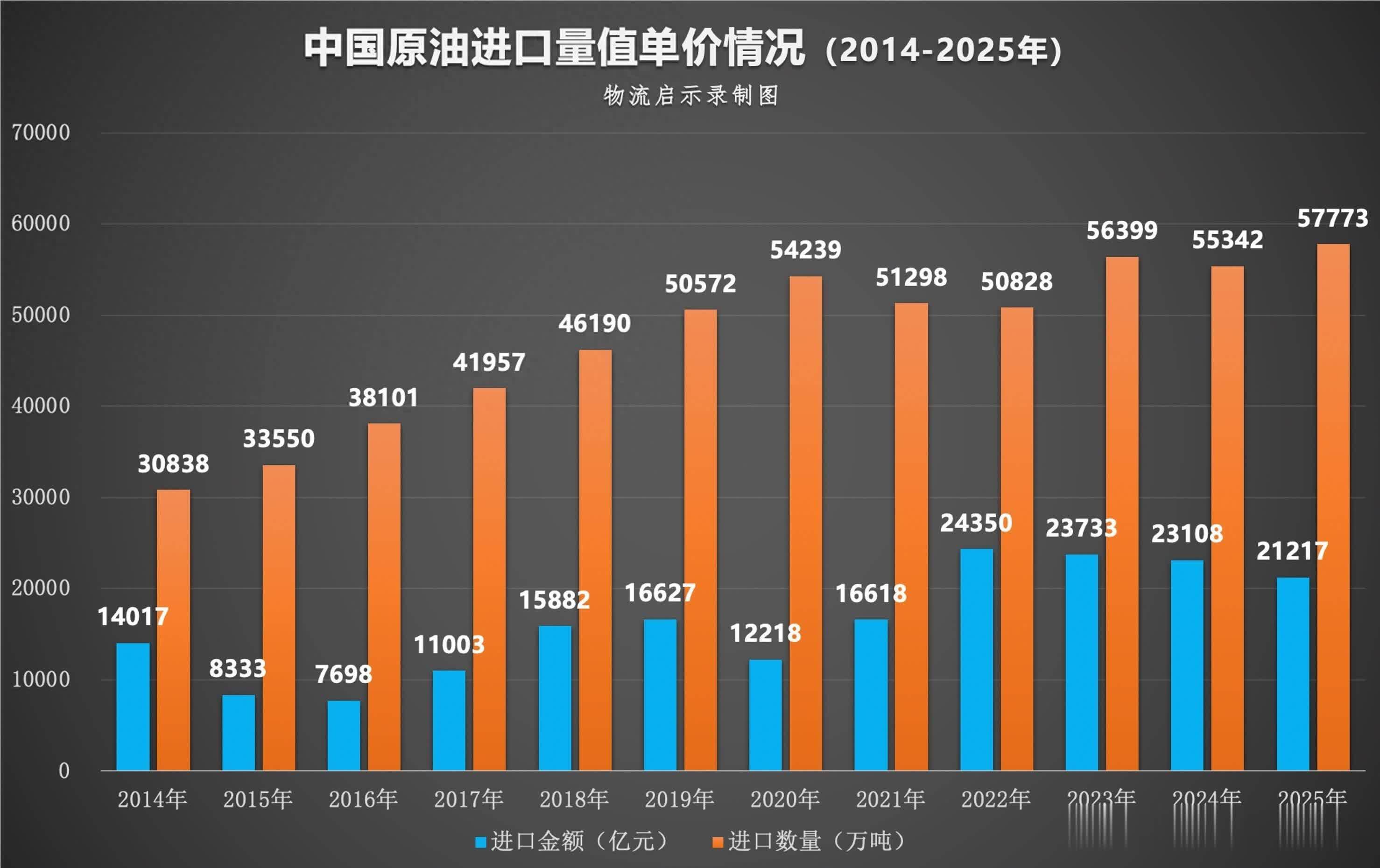 我国原油入口量值及单价情况(2014-2025年)