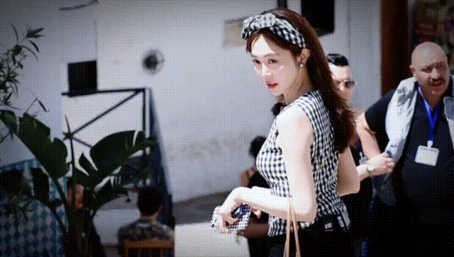 姜妍身着的那件瑕瑜格子无袖衫是她亲手缝制的。她还克己了一个同款格纹发带,戴上后显得格外芳华靓丽。