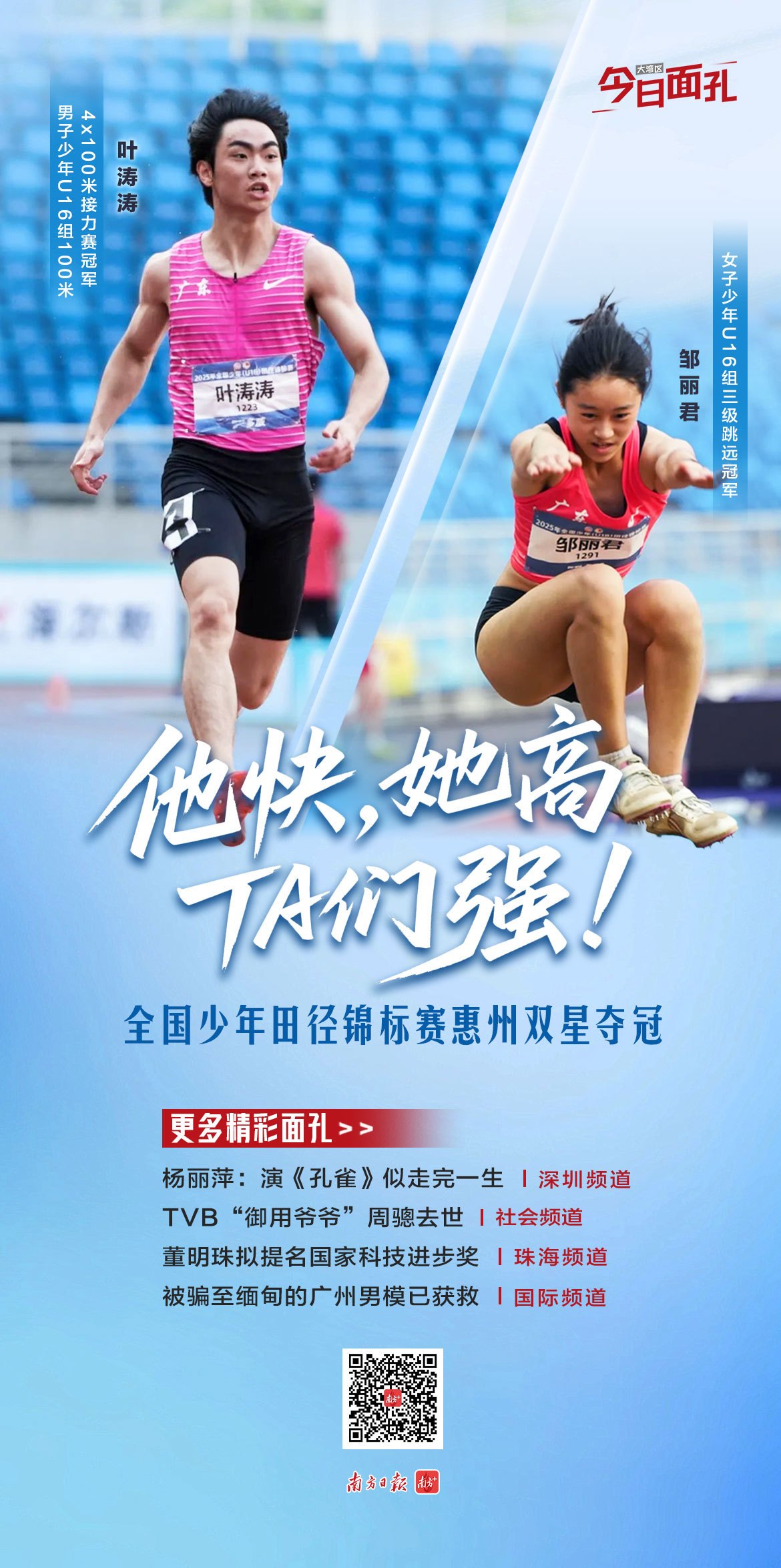 惠州两名小将发扬出色,17岁的叶涛涛在须眉100米和4x100米两项短跑神情中夺冠,颇有“苏神”风仪,15岁的邹丽君则凭借凌空一跃,赢得女子三级跳远冠军。少年好样的>>