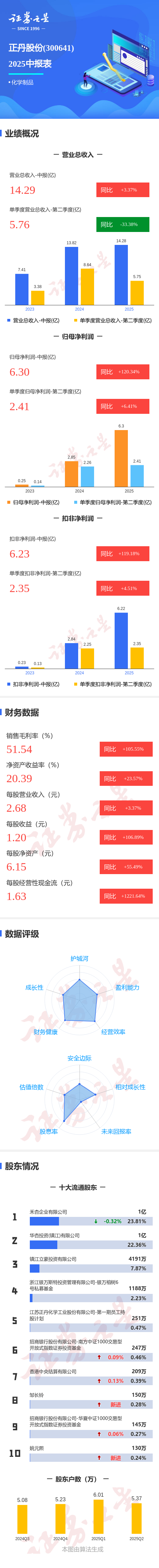 证券之星音书,正丹股份2025年中报融会,公司主营收入14.29亿元,同比高潮3.37%;归母净利润6.3亿元,同比高潮120.35%;扣非净利润6.23亿元,同比高潮119.19%;其中2025年第二季度,公司单季度主营收入5.76亿元,同比下落33.39%;单季度归母净利润2.41亿元,同比高潮6.42%;单季度扣非净利润2.35亿元,同比高潮4.51%;欠债率3.4%,投资收益386.79万元,财务用度-4233.99万元,毛利率51.54%。